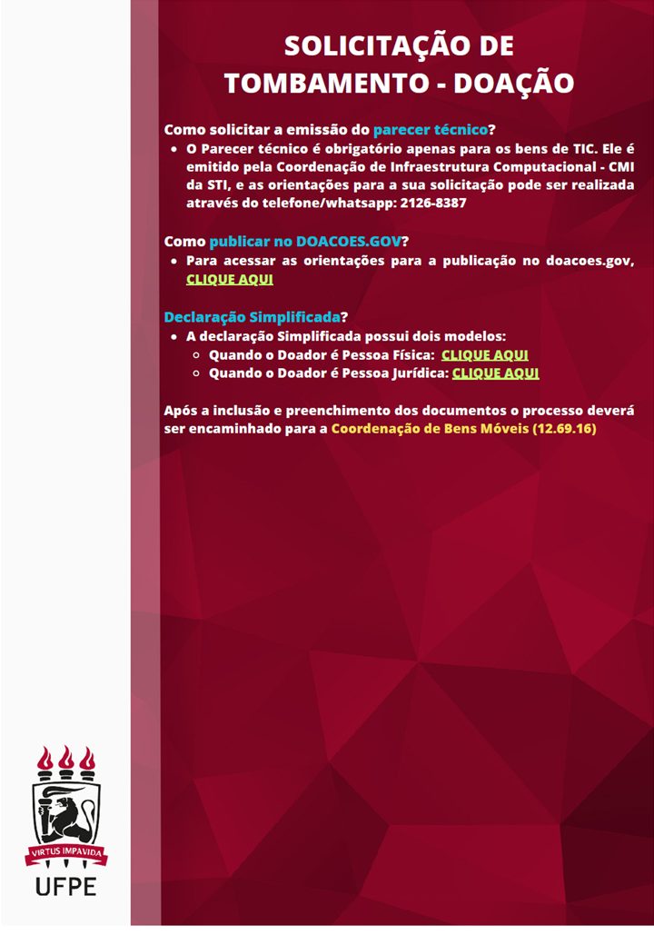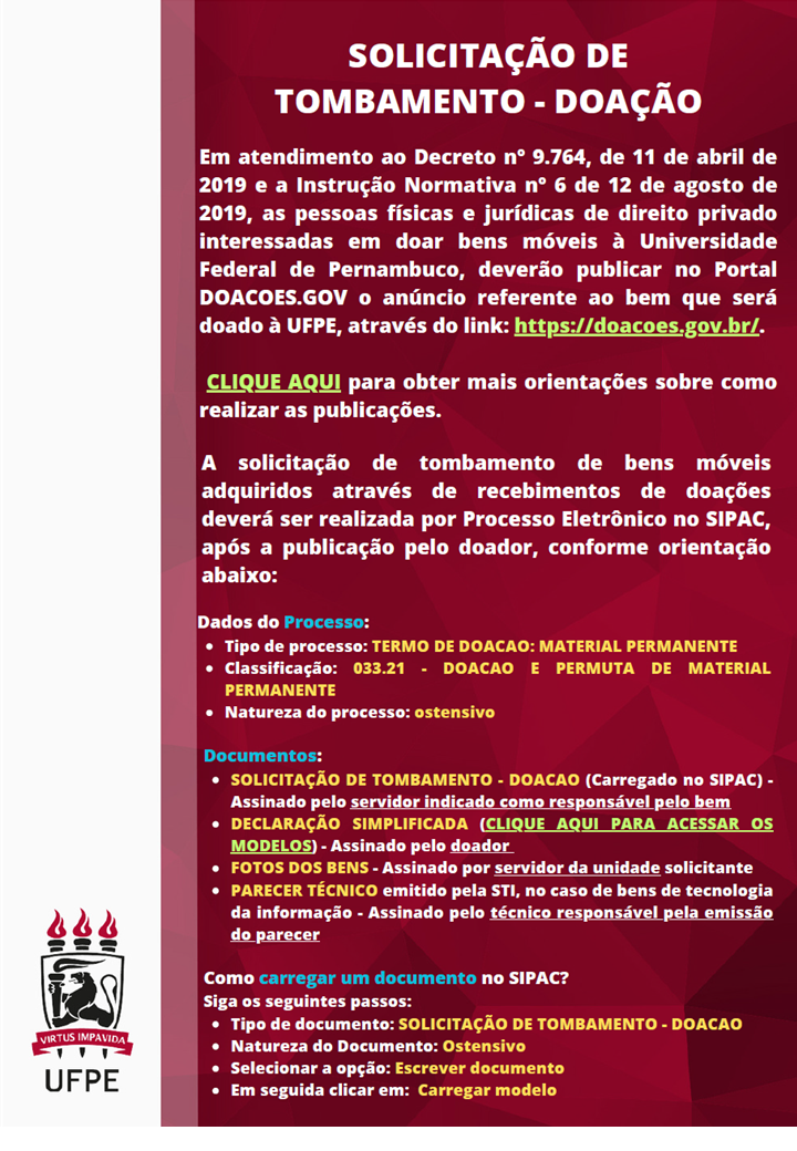 O Departamento de Anatomia da UFPE informa que o Programa de Doação de Corpos voltou a funcionar. O cadastro para doação do corpo em vida e o recebimento de cadáveres está sendo realizado normalmente.