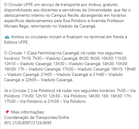 - HORÁRIOS DO ÔNIBUS CIRCULAR DA UFPE (LINK)