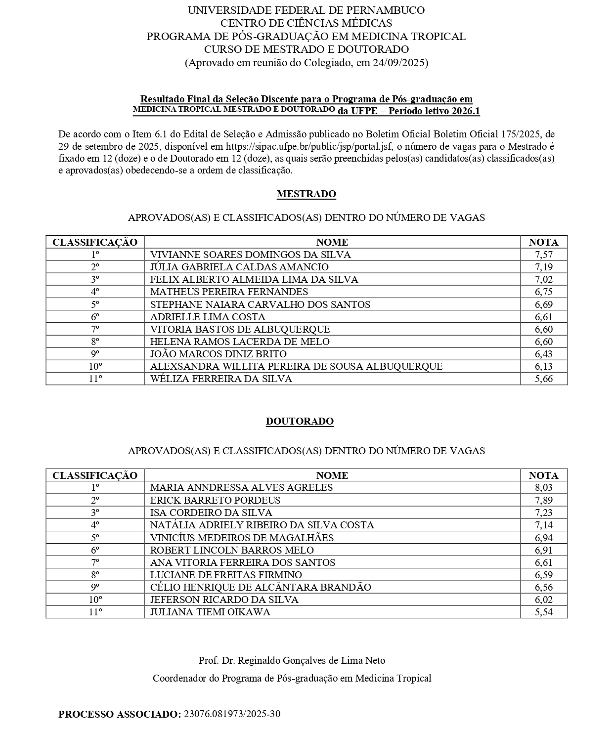 PROCESSO SELETIVO - MESTRADO E DOUTORADO - INGRESSO 2026.1