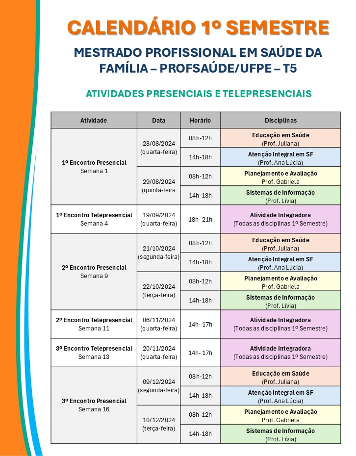 - Calendário de Atividades do PROFSAÚDE UFPE - 2024.2 (1º Semestre - Turma 5) - Clique aqui