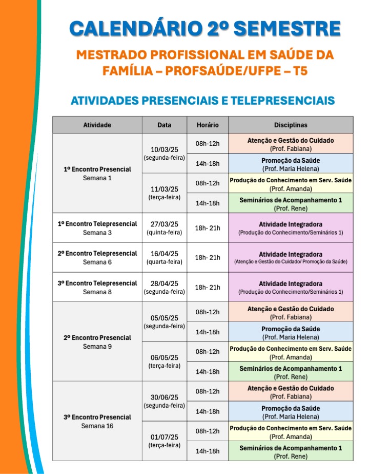 - Calendário de Atividades do PROFSAÚDE UFPE - 2025.1 (2º Semestre - Turma 5) - Clique aqui