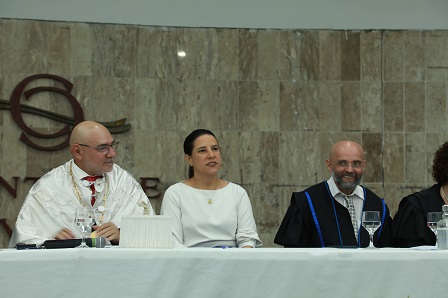 A mesa da solenidade foi composta pelo professor Ricardo Pinto de Medeiros, decano do Conselho Universitário da UFPE e vice-diretor do Centro de Filosofia e Ciências Humanas (CFCH); pela governadora do Estado de Pernambuco, Raquel Lyra; pelo prefeito do Recife, João Campos; pela professora Janete Maria Lins de Azevedo, do Programa de Pós-Graduação em Educação e do curso de Pedagogia – que foi a responsável pela saudação à gestão de Alfredo Gomes e Moacyr Araújo, representando os docentes da Universidade –; pela presidenta da Fundação Joaquim Nabuco (Fundaj), professora Márcia Angela da Silva Aguiar; pela servidora Camila Albertina Dantas de Lima, técnica de laboratório do Departamento de Oceanografia e representante do corpo técnico administrativo em educação da UFPE, e pela estudante do Centro de Educação (CE) Débora Karolayne da Silva, representante do corpo discente da Universidade.