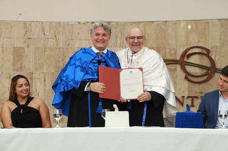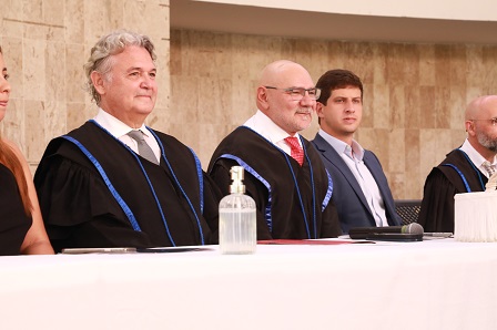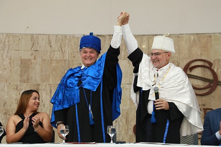 Os professores Alfredo Macedo Gomes e Moacyr Cunha de Araújo Filho foram reconduzidos aos cargos de reitor e vice-reitor da UFPE, respectivamente, na última sexta-feira (27), em solenidade no hall do Centro de Convenções da Universidade Federal de Pernambuco (UFPE). No seu discurso, Alfredo Gomes afirmou que “é muito bom contar com alguém como o professor Moacyr Araújo para compartilhar uma tarefa como essa de gerir uma universidade”. Moacyr Araújo disse que, além de parceria na gestão, “o professor Alfredo Gomes é um grande amigo”. E destacou que a parceria entre os dois “dá tão certo por conseguirmos levar tudo com leveza e bom-humor”. Ambos destacaram a força da UFPE em enfrentar o período da pandemia de covid-19 e hoje iniciarem juntos o segundo mandato, para o período 2023-2027.