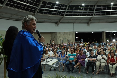 SAUDAÇÃO - A professora Janete Lins realizou uma saudação à gestão anterior de Alfredo Gomes, e disse se sentir, de certa forma, também reconduzida, principalmente por também ter realizado o discurso panegírico da posse do primeiro mandato, há quatro anos. Porém, ela disse que felizmente a cerimônia ocorria em um contexto socioeconômico muito diferente do qual ocorreu a posse de quatro anos atrás. “O que não significa que não temos desafios a superar. Entre os desafios da UFPE, estão os novos padrões de sociabilidade, a predominância do individualismo, dentre outros”, afirma. Ela destacou a criação de bolsas de manutenção de discentes e a ampliação do Restaurante Universitário, entre os feitos do período. E a professora finalizou recitando o poema “Tecendo a manhã”, de João Cabral de Melo Neto.