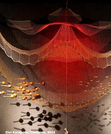 A obra que Ziel Karapotó apresentará na Bienal de Veneza se chama “Cardume” e consiste em uma ampliação e releitura de uma de suas instalações, que faz parte do acervo do Museu Paranaense e integra a exposição coletiva indígena “Mejtere: histórias recontadas”. A instalação “Cardume” tem dimensões de 3m x 3m e é composta por uma tarrafa de pesca artesanal, maracás, projéteis-munições de resina e uma paisagem sonora. “Quarenta maracás formam um cardume que fica de frente ao de projéteis, numa relação de tensionamento de forças de poder”, afirma Ziel Karapotó.