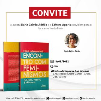 O livro “Encontro com Feminismos: políticas, teorias e ativismos” será lançado, no dia 18 deste mês, às 19h, no Centro de Capoeira São Salomão, que fica na Rua Amaro Gomes Poroca, 268, bairro da Várzea, no Recife. A obra tem autoria da professora Karla Galvão Adrião, do Departamento de Psicologia e do Programa de Pós-Graduação em Psicologia da UFPE. O evento é realizado pela A Coletiva (Labeshu/UFPE), Editora Appris, PPGPsi/UFPE e Centro de Capoeira São Salomão. Em parceria com o Projeto É Cor de Rosa Choque, do Centro de Capoeira São Salomão, o lançamento será um espaço de encontros, trocas e diálogos sobre o livro e sobre o feminismo em sua pluralidade.
