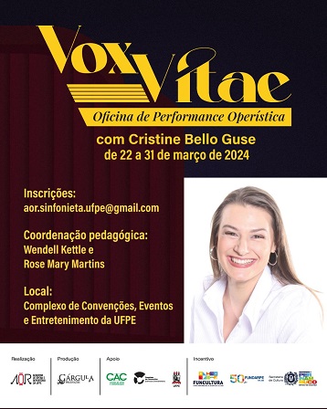 A Academia de Ópera e Repertório da UFPE (AOR) inicia o ano de 2024 recebendo a mezzo-soprano Cristine Bello Guse para o projeto “Vox Vitae” – Oficina de Performance Operística, que acontecerá de 22 a 31 deste mês, no Complexo de Convenções, Eventos e Entretenimento da UFPE (CCEE). “Vox Vitae” é um projeto de formação, capacitação e aperfeiçoamento em “ópera performance” para cantores-atores líricos e visa fomentar a atividade operística e, por conseguinte, o desenvolvimento da ópera em Pernambuco.