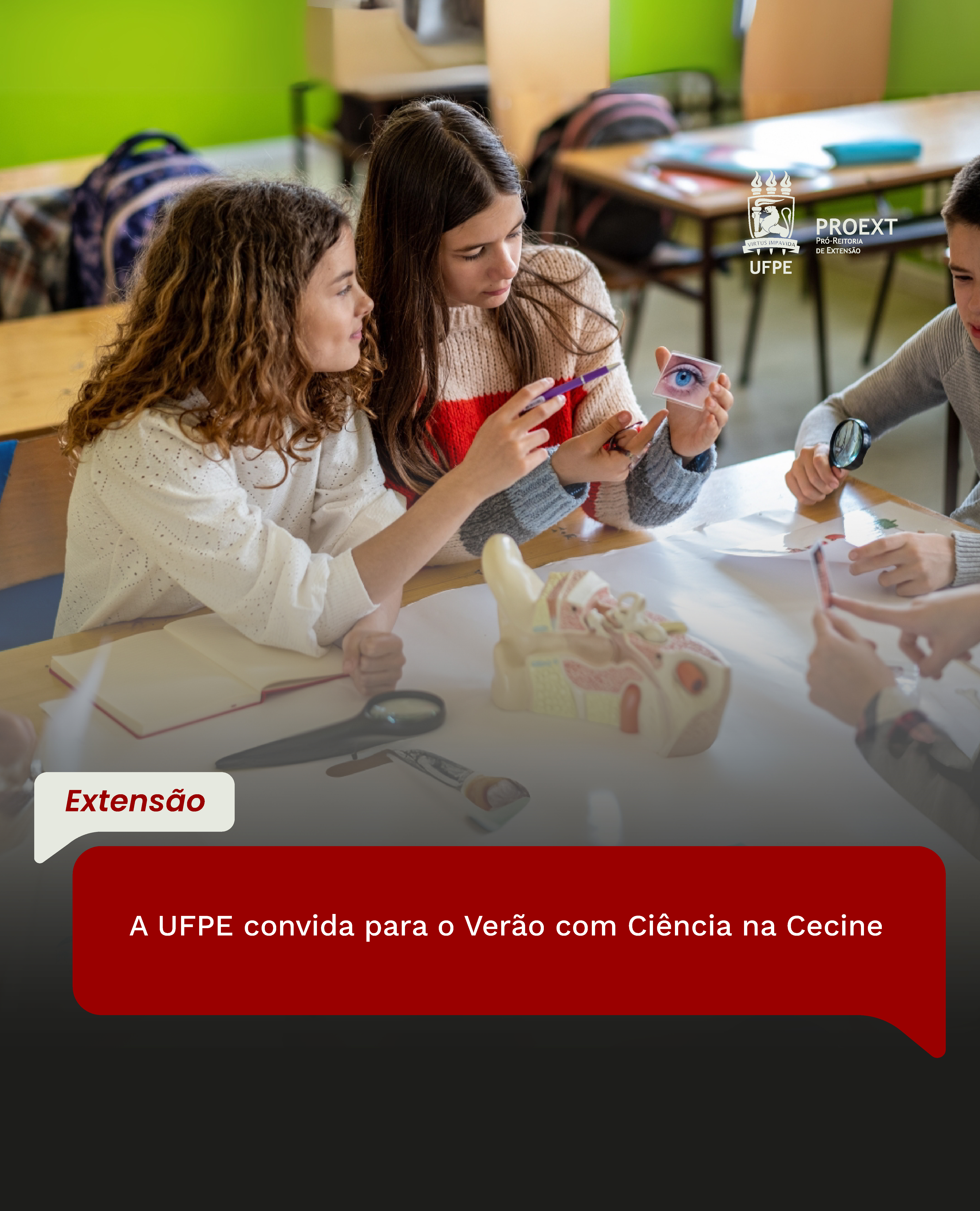 A Pró-Reitoria de Extensão da Universidade Federal de Pernambuco, através da Cecine, tem o prazer de convidar todos para participar de oficinas e minicursos que serão realizados no "Verão com Ciência na Cecine". O evento acontecerá de 10 a 20 de fevereiro de 2025, na Cecine. A programação é aberta ao público e visa promover a interdisciplinaridade; integrar ensino, extensão e pesquisa; além de incentivar o protagonismo dos estudantes do Ensino Superior.
